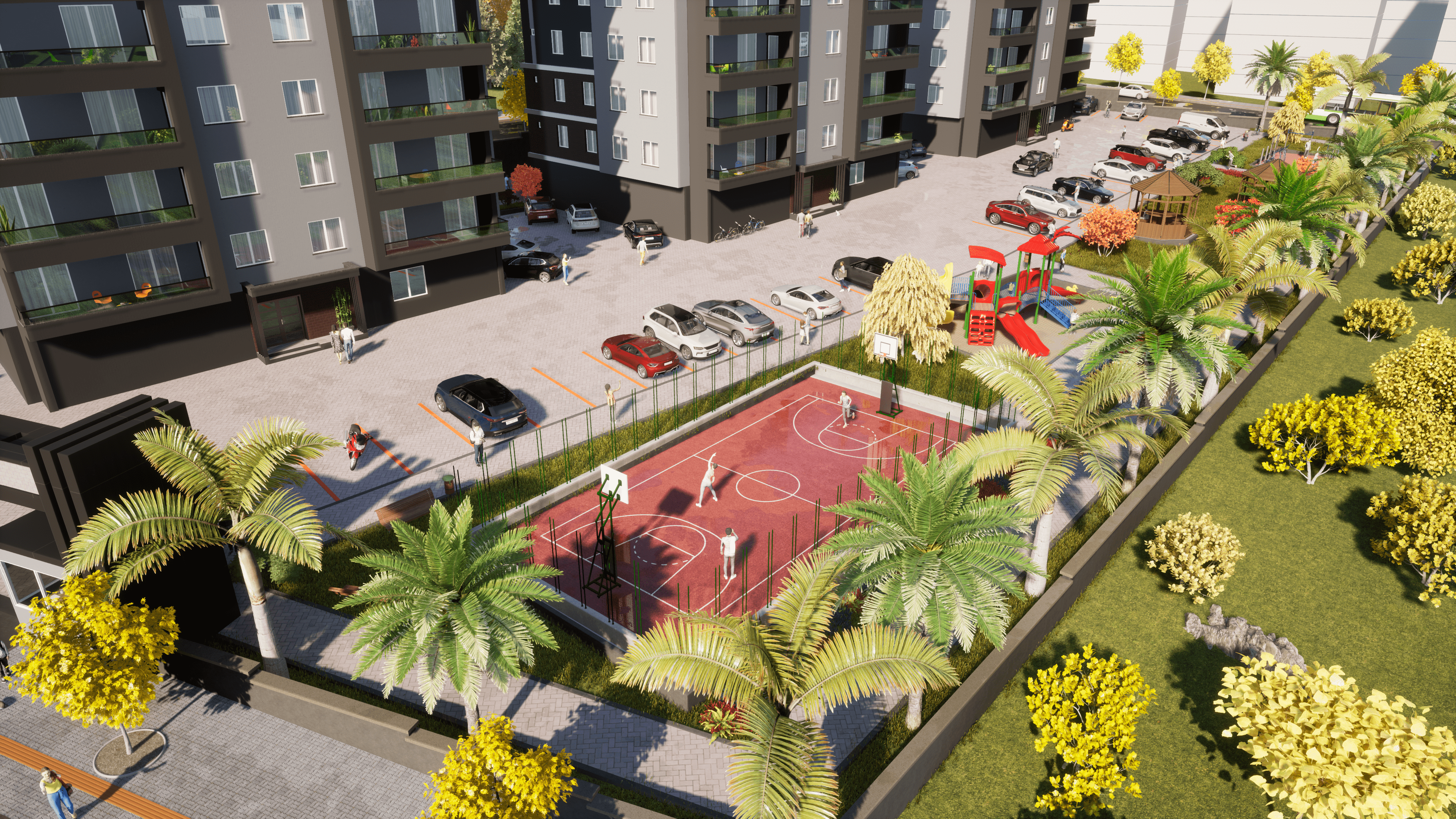 Sosyal donatılar: Fitness salonu, basketbol sahası, çocuk oyun alanları.